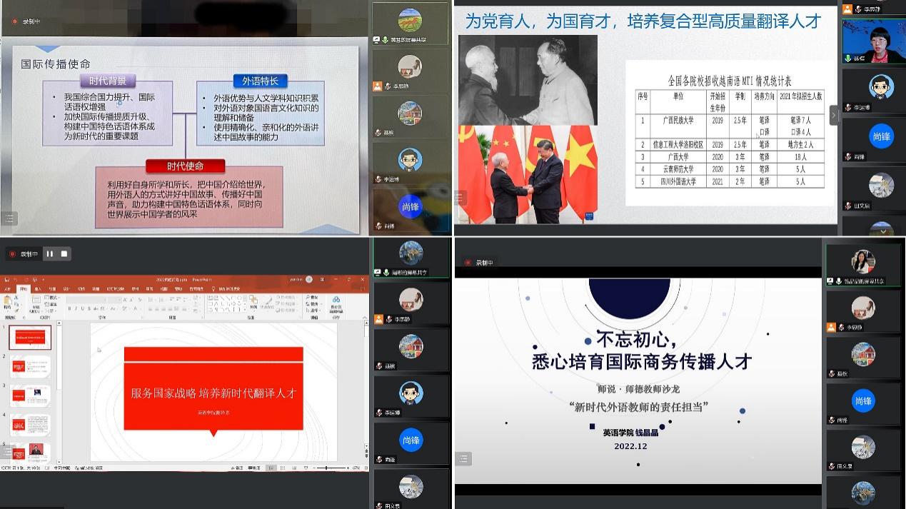 外语免费a片 黄慧教授以“践行外语人的时代使命,向阿拉伯世界传播好中国声音”为主题、聂槟教授以“小语种在国际传播中的大作为”为主题,免费a片 阎彬副教授以“服务国家战略,培养新时代翻译人才”为主题、钱晶晶副教授以“不忘初心,悉心培育国际商务传播人才”为主题做经验分享,就深入学习领会党的二十大精神、运用外语教师的专业优势在讲好中国故事、培育国际传播人才方面的经验体会,呼吁广大外语教师坚定立场、树立信念,以理论指导实践,不断推动学术研究和社会服务与国际传播实践相互促进,不断提高讲好中国故事的能力,利用外语优势为中国在国际上赢得更多理解、支持;呼吁外语学科教师秉承“为党育人 为国育才”的初心,潜心培育国际传播人才,为新时代中国高水平对外开放培养更多骨干力量。