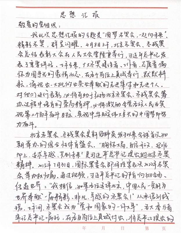 2018级党员胡博文谈到,五四青年节到来之际,我有幸同大家一起,在线上观看了“圆梦冬奥会,一起向未来”的首都教育系统弘扬北京冬奥精神思政大课。双奥之城的北京顶住了疫情的压力,向全中国和世界人民交出了一份满意的答卷。北京冬奥会、冬残奥会的成功举办,实现了带动三亿人参与冰雪运动的美好愿景,展现了中国当代青年奋勇拼搏的形象,同时也展现了中华民族砥砺前行,勇攀高峰的精神。通过六位主讲人的阐述,我们明白了人生只有一次的青春,现在是用来奋斗的,将来是用来回忆的。青年时代树立正确的理想,坚定的信念,十分重要,不仅要树立,而且要在心中扎根一辈子都能坚持为之奋斗。我们当代中国青年应当满怀对祖国和人民的赤子之心在党的领导下,积极投身革命、建设、改革的伟大事业,用青春之我创造青春之中国、青春之民族,谱写中国青年运动的壮美篇章。