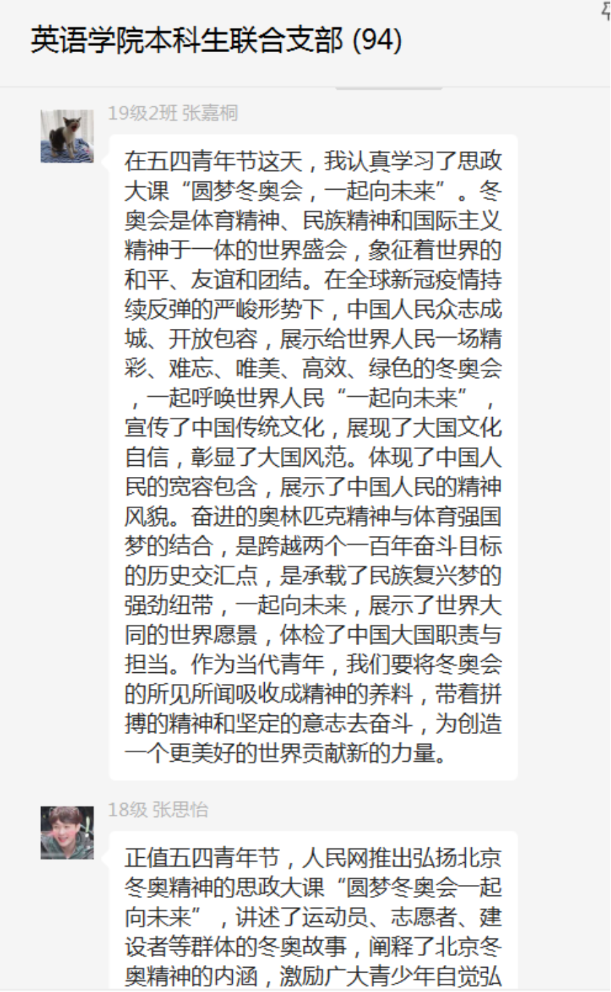 2019级党员马冰睿谈到,在五四青年节之际,人民网面向广大青年推出了弘扬北京冬奥精神“圆梦冬奥会一起向未来”的思政大课。它不仅将北京冬奥精神与青年实践生动结合起来,更从历史层面以及现实层面阐释了我国当代青年的使命与任务并激励广大青少年自觉弘扬北京冬奥精神,奋力担负起“请党放心,强国有我”的历史使命。顺利结束的北京冬奥会以及冬残奥会是青年力量的生动体现和真实写照。我作为一名冬奥会和残奥会志愿者也参与其中,志愿者们在工作中将属于年轻一代蓬勃向上的精神面貌,精益求精,无私奉献的工作态度以及包容友好的中国形象展现得淋漓精致,得到了世界各国的认可。在实现中华民族伟大复兴的新征程中,我们青年一代应当接过历史任务,迎难而上,不畏挑战,以昂扬奋进的姿态书写下无愧时代的壮丽篇章。