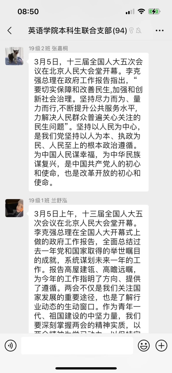 2019级姚可譞:聆听了李克强总理代表国务院所作的《政府工作报告》,深感振奋。总理在报告中提出,“今年我国发展面临的风险挑战明显增多,必须爬坡过坎。越是困难越要坚定信心、越要真抓实干。”“中国经济一定能顶住下行压力,必将行稳致远。”这既是一种豪迈的信心和勇气,也是对全体中国人民提出的战斗总动员令!展示了中国人民传承的不畏艰险,勇往直前的革命意志,同时也给全国人民在经济发展道路上吃了一颗定心丸。作为高校学子,我们更要始终秉持人民底色,积极深入基层,将理论知识融入具体的社会实践当中。