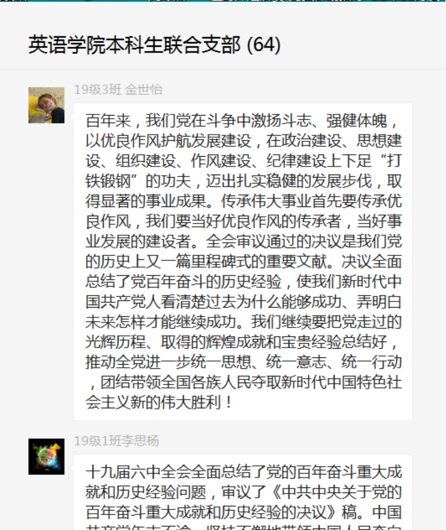2018级党员曹宸源谈到,我对公报进行了认真学习,深刻认识到了只有中国共产党才能带领中国人民实现中华民族的伟大复兴。正是在中国共产党的带领下,中国人民完成了伟大的脱贫攻坚,控制住了疫情。中国经济恢复良好,成为世界上经济恢复最好的国家之一。在今年山西的洪灾中,我身边的共产党员更是发挥先锋队作用,积极进行抢险救援,冲在最前线,保护人民的生命与财产安全。我作为一名中国共产党预备党员,会坚定理想信念,始终跟随党的脚步,时刻准备着,为把中国变得更好而努力奋斗。