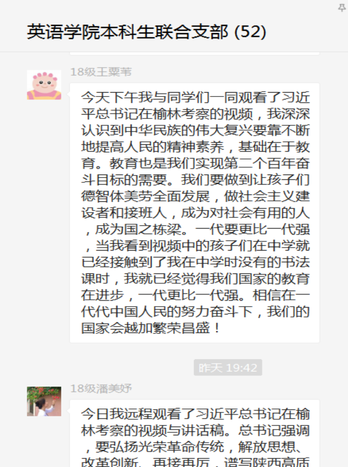 2019级党员兰舒泓谈到,令我印象最深刻的是总书记于绥德实验中学同师生们亲切交流的场景。他表示,要深化教育教学改革,落实立德树人根本任务,厚植爱党、爱国、爱人民、爱社会主义的情感,努力培养德智体美劳全面发展的社会主义建设者和接班人。总书记的谆谆教诲,让我深受教育。我们要深刻领会习近平总书记的重要讲话精神,牢记初心,修身立德、勤学上进,珍惜大好年华,成长为对国家、对人民、对社会有用的人。