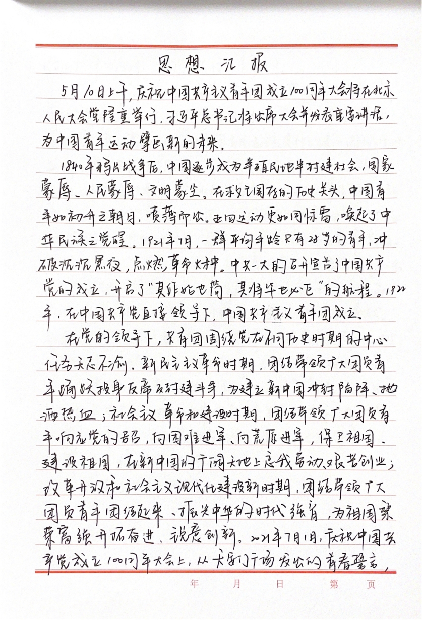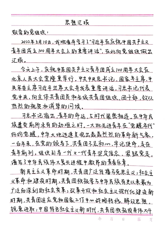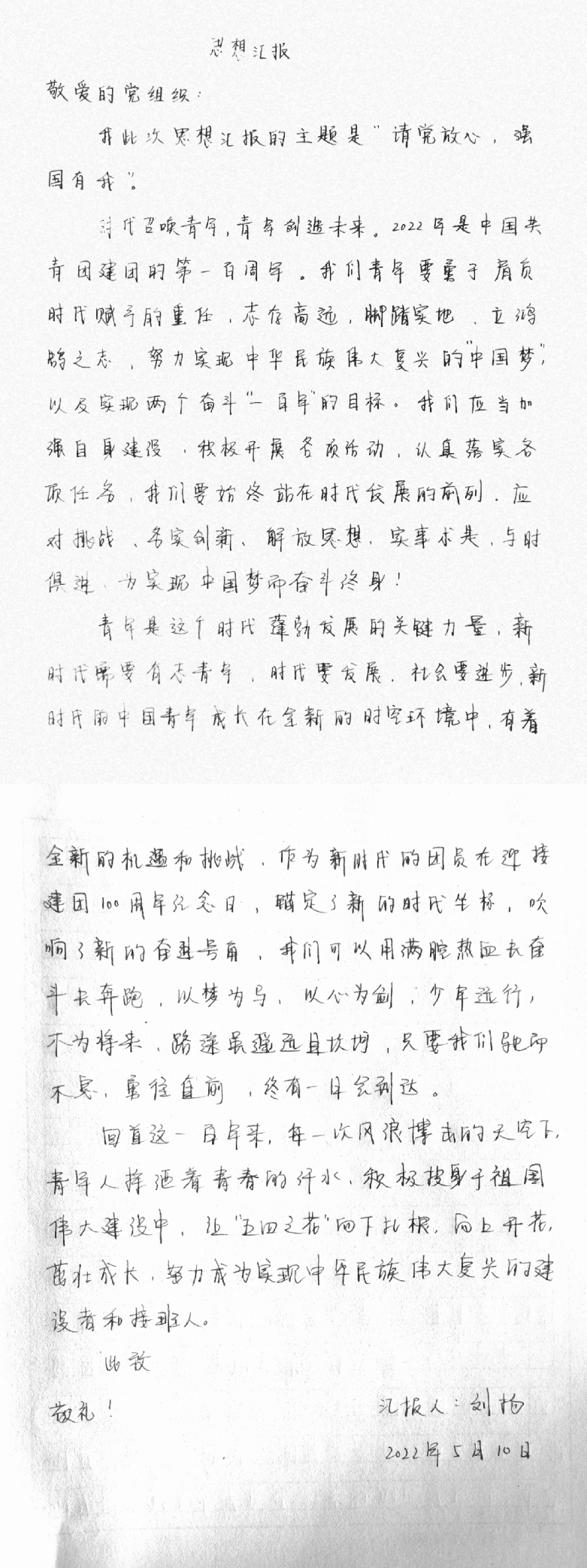 2020级张文程谈到,在实现中华民族伟大复兴的征程上,中国共产党是先锋队,共青团是突击队,少先队是预备队。入队、入团、入党是青年追求政治进步的“人生三部曲”,作为党的发展对象,我会时刻铭记习近平总书记在建团一百周年大会上的讲话,铭记党的嘱托和团的培养,为时代中国贡献属于自己的强国之音,不断开拓更加美好的未来。