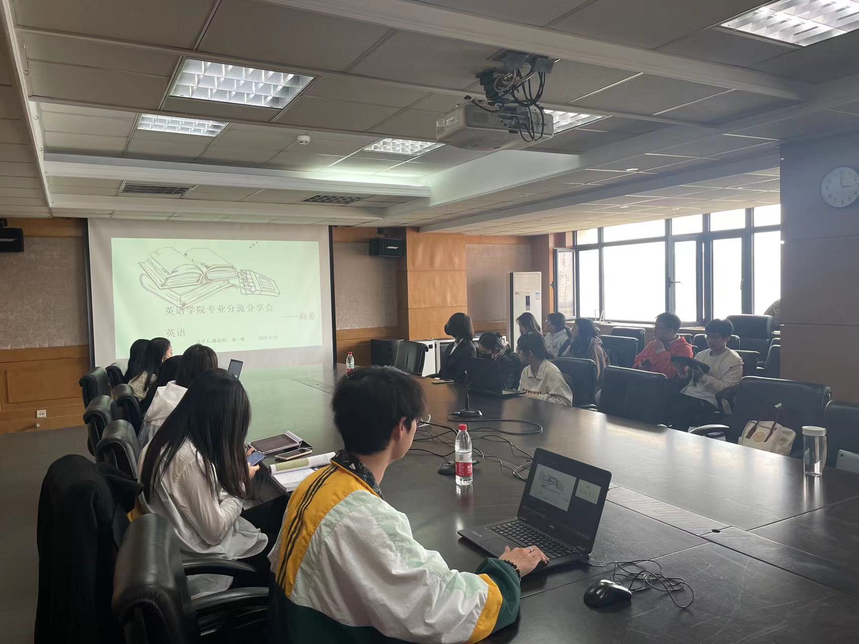 4月27日下午,免费a片 本科生联合党支部的九名党员在诚信楼1314举办“学生党员微课”分享会,向即将面临专业分流选择的2022级学生介绍了商务英语、翻译、国际传播、语言学、文学五个不同专业方向的相关情况。