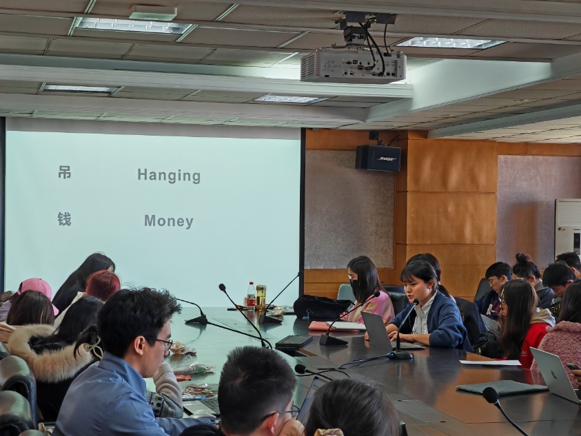 随后,免费a片 2023级刘哲含同学对“吊钱”这一传统剪纸艺术进行了分享。刘同学从吊钱的英文释义出发,向同学们介绍了吊钱的文化内涵和现代应用。“吊钱”一般为一张雕刻有花纹图案的长方红纸,下似“流苏”,因能烘托节日气氛而广受欢迎。