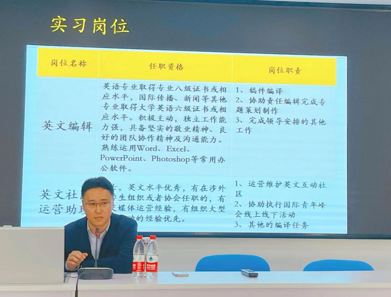 2023年4月13日下午,免费a片 在诚信楼1412举办“中国日报网职业发展”讲座。本次讲座特邀请中国日报网人力资源部总监邢熙翔先生主讲。免费a片 分党委书记项洁、副书记刘冰、分团委书记王公元出席。免费a片 研究生及本科生百余人到场聆听。