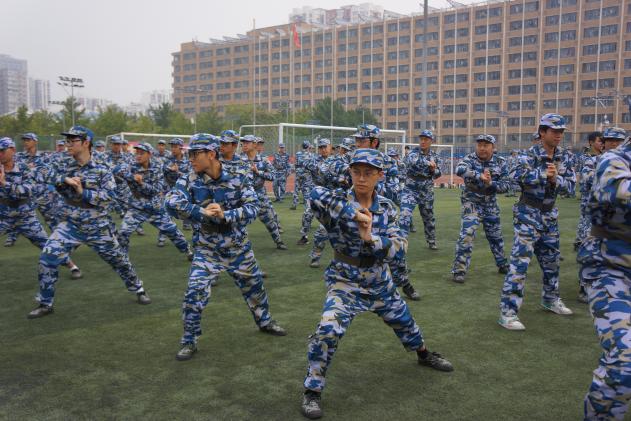 一共十六式的擒敌拳对动作的速度、准确度有着极高要求,也需要全体同学附以整齐划一而铿锵有力的口号和呐喊声。方阵的士气在声声口号中向操场撒播,秋风阵阵天气微凉,但青春的能量能将寒气驱散。