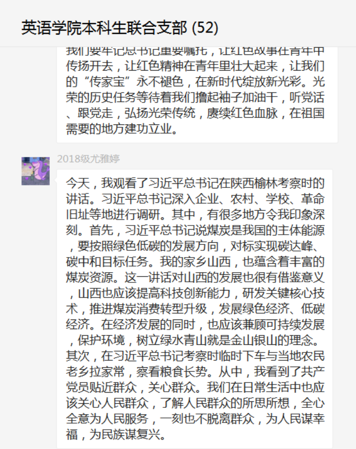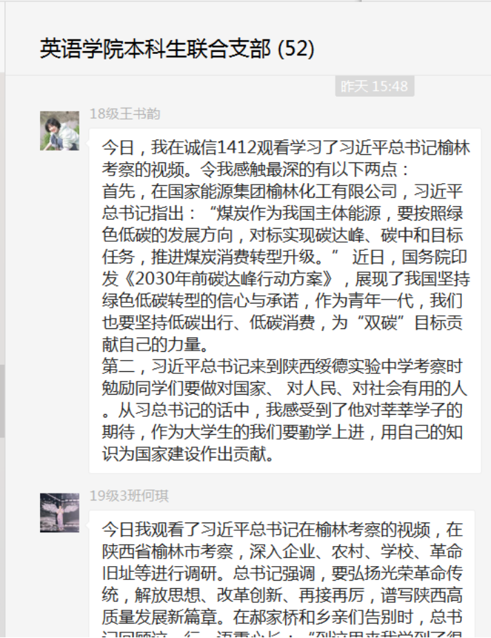 2019级党员兰舒泓谈到,令我印象最深刻的是总书记于绥德实验中学同师生们亲切交流的场景。他表示,要深化教育教学改革,落实立德树人根本任务,厚植爱党、爱国、爱人民、爱社会主义的情感,努力培养德智体美劳全面发展的社会主义建设者和接班人。总书记的谆谆教诲,让我深受教育。我们要深刻领会习近平总书记的重要讲话精神,牢记初心,修身立德、勤学上进,珍惜大好年华,成长为对国家、对人民、对社会有用的人。