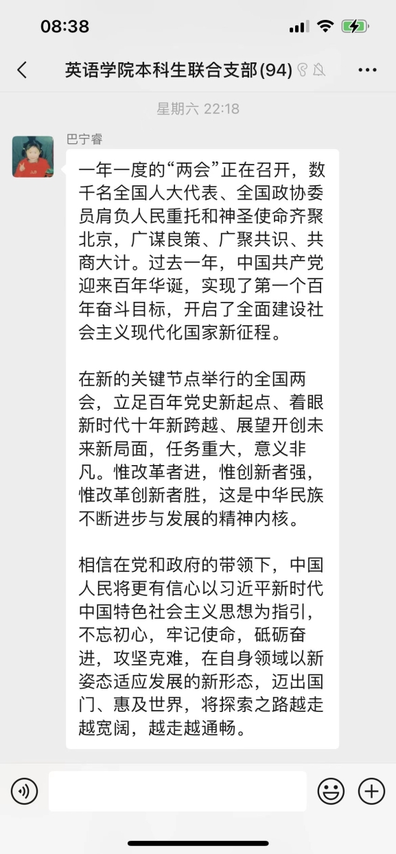 2018级曹宸源:我十分激动全国政协十三届五次会议的成功召开,与会全国政协委员听取了政协全国委员会常务委员会工作报告。委员提到了以下内容:巡回审判让群众在家门口感受到公平正义;“双减”推动教育回归本质,促进全面发展;北京冬奥会场馆要加强赛后可持续利用,实现场馆的后奥运价值。2021年,我有幸参与了北京冬奥会的志愿服务,在这之中感受了祖国的强大;国家治理能力强大,采取科学的疫情防控措施,进行闭环管理,做到疫情零外溢的同时保证涉奥人员安全,中国的奥运闭环被称为世界上最安全的地方。此外,外国运动员还都纷纷称赞中国的奥运比赛场地及相关服务和保障,在我服务的场地外国贵宾纷纷用中文写下了“谢谢中国”。2022,中国的成就一定会再创新高!