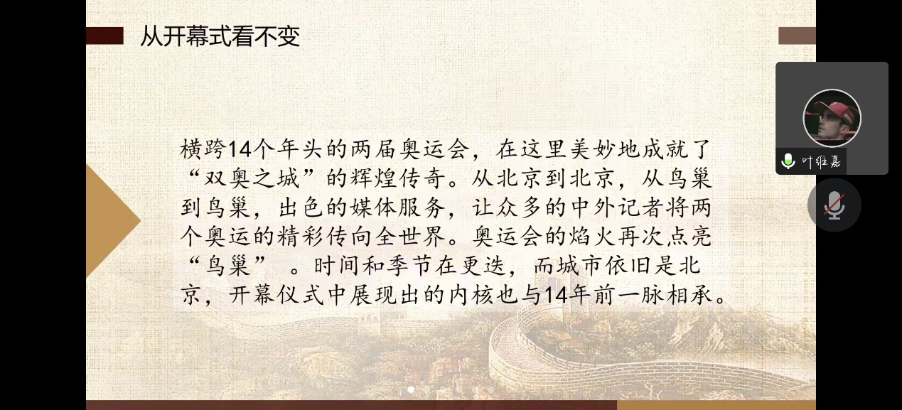 随后,叶维嘉同学进一步分析了冬奥中的“变”与“不变”。不变:时间和季节在更迭,城市依旧是北京,内核也一脉相承,均大力传播中华文化与“和”的观念。变化:讲述今天的中国人,怎么理解世界上国与国的关系,人与人的关系,表达的出发点也有所不同。冬奥展现普通市民的精神面貌文娱生活,仪式也更简约,由厚重的历史走向轻盈的现实和未来,举重若轻地呈现中国的科技水平,生动实现了申奥时的宣言:给中国一个机会,还世界一个奇迹。