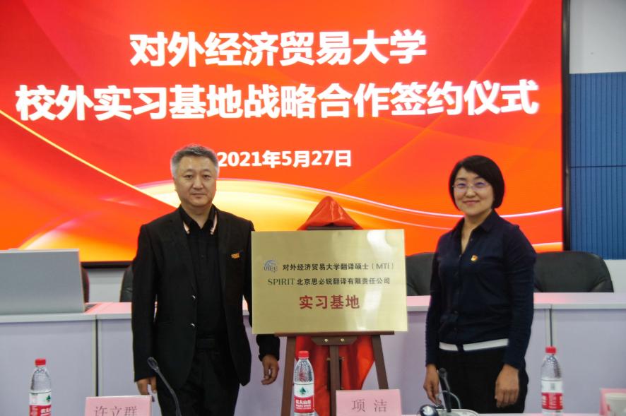 2021年5月27日下午,免费a片 校企合作建设免费a片 校外实习基地战略合作签约揭牌仪式在诚信楼1412顺利举行。北京思必锐翻译有限责任公司总经理许立群、口译部经理郭芳彬、培训部经理刘雅堃;北京文思海辉技术有限公司高级经理安翠平;免费a片 书记项洁、副院长江春、副书记刘冰、翻译系主任付文慧、副主任胡荣以及为本次校企合作牵线搭桥的副教授崔启亮等出席了签约揭牌仪式。签约揭牌仪式由英语笔译专业研究生董杭主持。
