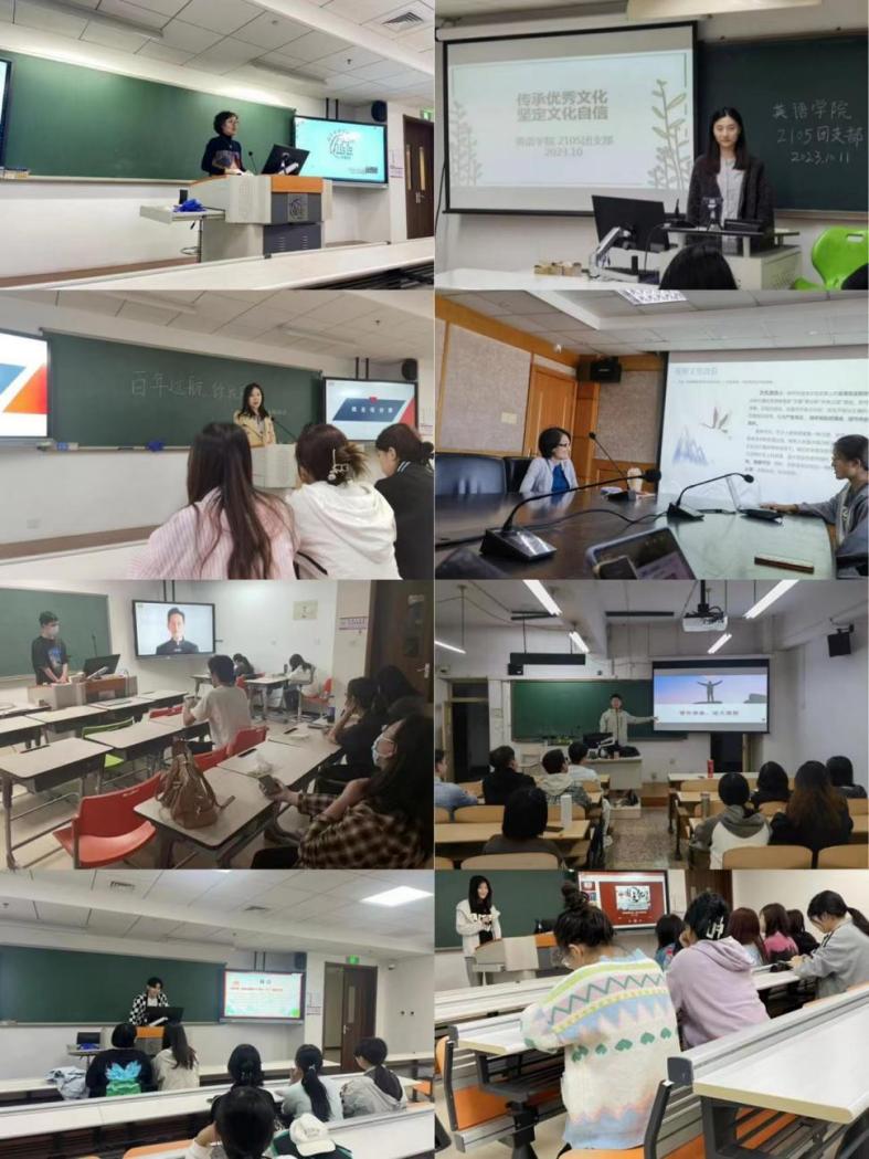 英实2101班以亚运会作为引入开展班会。班长吴珂对杭州亚运会的文化元素作出介绍,并邀请杭州同学探讨这些文化元素与杭州传统文化的关联。班主任付涛老师则结合同学们的专业,从传播学角度出发介绍了生活中的文化元素;英语2101班从反面解读文化自卑和文化自负两种心态,帮助同学们切实理解“文化自信”的概念。班主任李啸初老师提出,同学们要确立坚定的文化自信,从容面对西方文化的冲击和挑战,并在全球化浪潮中不断扩大中华文化在全球范围内的传播和影响;英语2102班班会以同学分享、视频观看、分组讨论的形式展开,旨在深化学生的爱国主义教育、增强文化自信、激发使命担当。班主任时晓英老师做总结发言,鼓励同学们明确理想、奋发向前;英语2103班探讨了如何保持大学生的青春底色,认为当代大学生应树立正确的世界观和人生观,注重内在修养,成为有道德情操和文化修养的优秀青年;英语2104班探讨了传承优秀文化与坚定文化自信的重要性,班主任赵冬旭老师总结并强调文化传承与学术拓展;英语2105班聚焦于文化精品走出国门的话题,班长胡雪阳带领大家探究戏曲出海案例,同学们对中华传统文化出海产生了更深刻的见解;英语2106班班会中,秦莉婷同学、周梓依同学依次展示学习传统书法的成果及参观古建筑的心得体会,引起热烈讨论;英语2107班以免费a片 校史剧《远航》为导入,介绍我国百年外贸史的几个重要阶段,以及先辈们为中国对外贸易事业的伟大贡献,以此激励同学们奉献青春、砥砺奋斗,为我国外贸事业的发展贡献自己的一份力量。