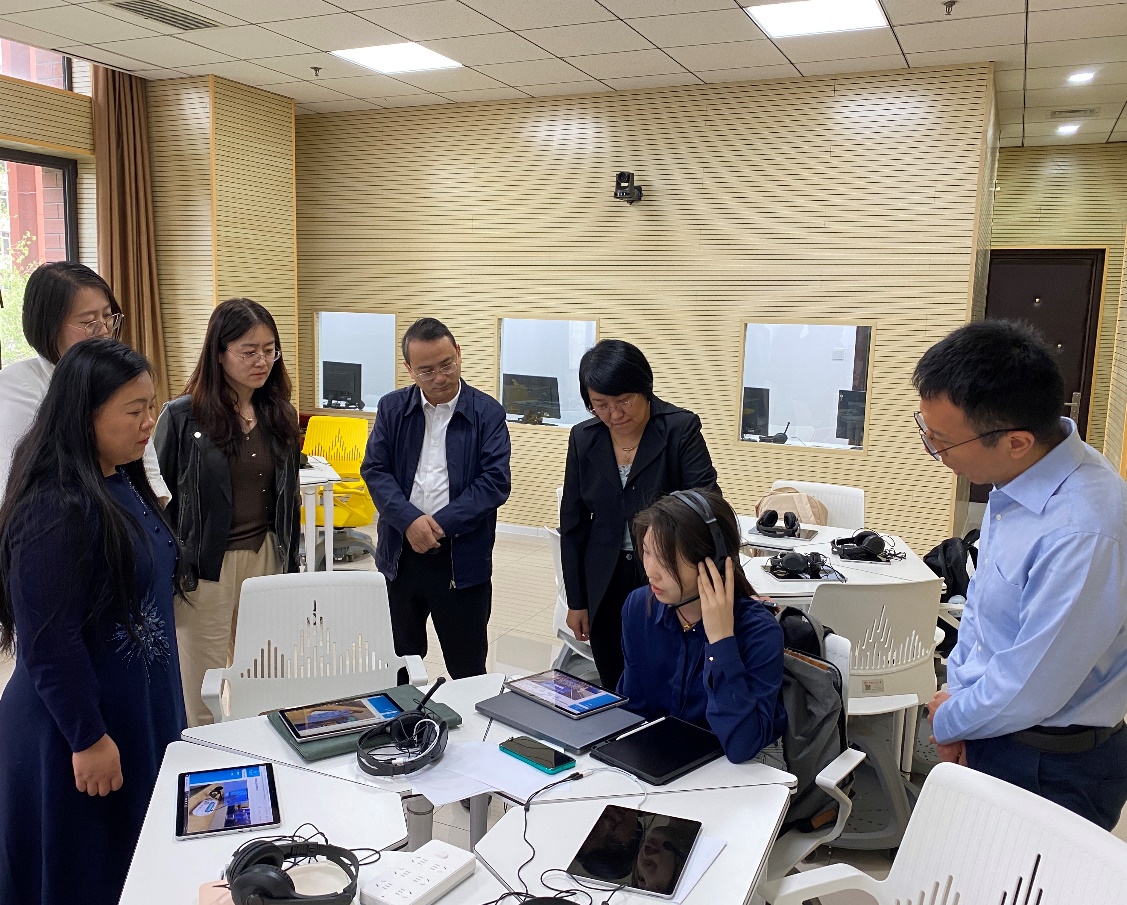 座谈会后,项洁书记一行参观了中国人民大学国际会议口译虚拟仿真实验室和智慧教室,深入了解了人大外国语免费a片 在实验室和国家一流课程建设方面的理念、方法和经验,现场观摩了虚拟仿真平台在口译实训中的运用,体验了智慧教室的设备操作。