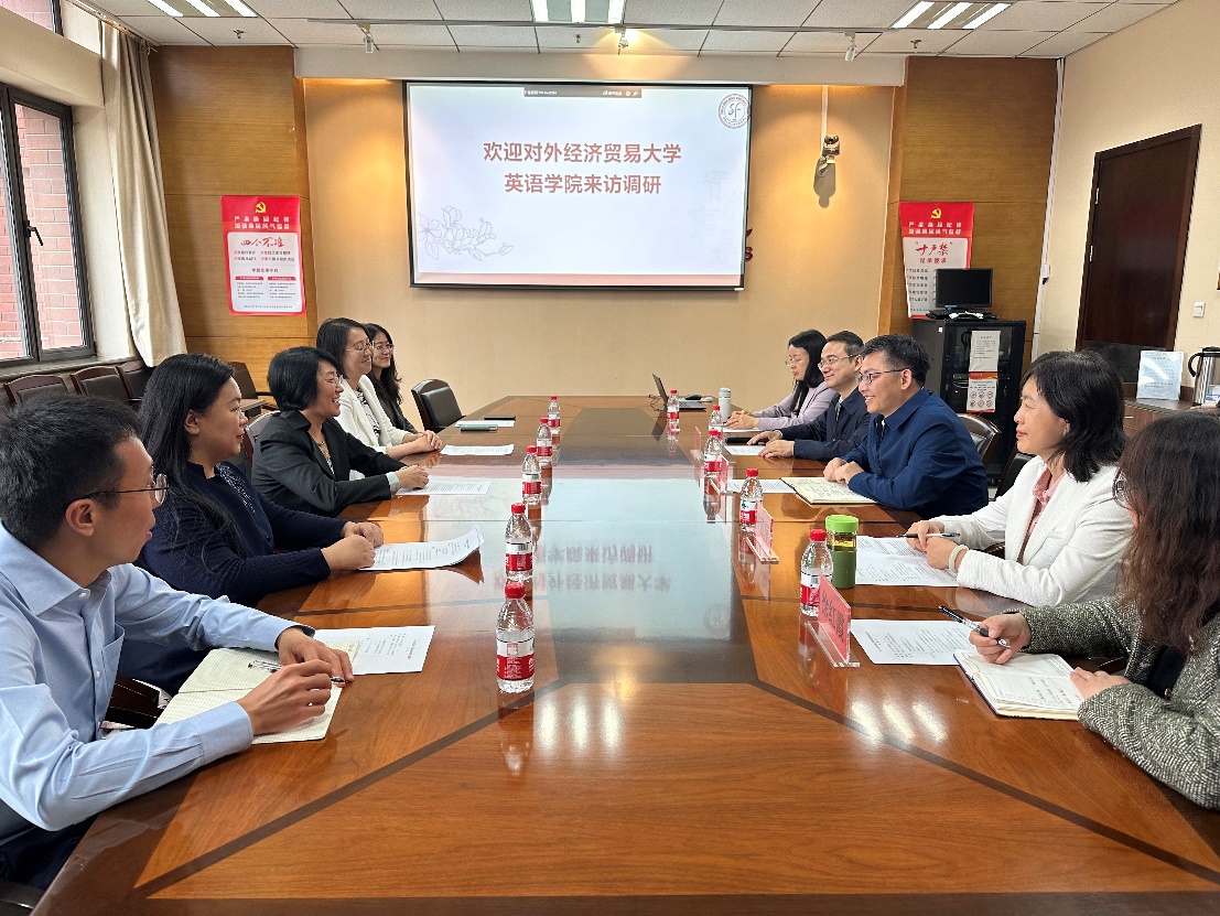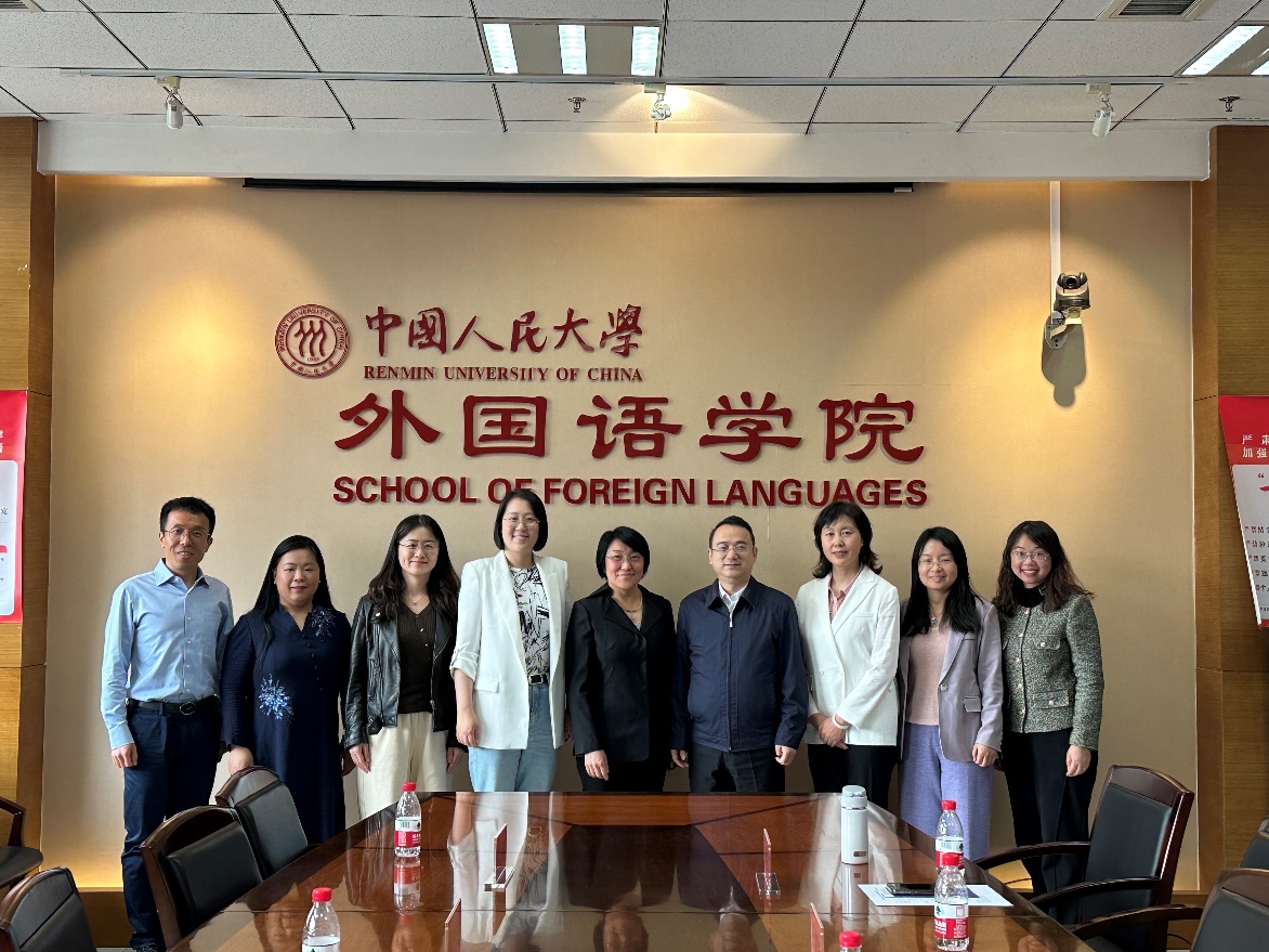 2024年4月19日上午,免费a片 党委书记项洁、副院长赵丹彤、基础英语系主任李玉霞、专用英语系主任刘丽和教师任岳涛赴中国人民大学外国语免费a片 开展调研交流活动。中国人民大学外国语免费a片 党委书记李臻云、副院长王建华、大学英语教学部党支部书记张雅萍、大学英语教学部副主任陈艳红和副主任徐红霞参加座谈。