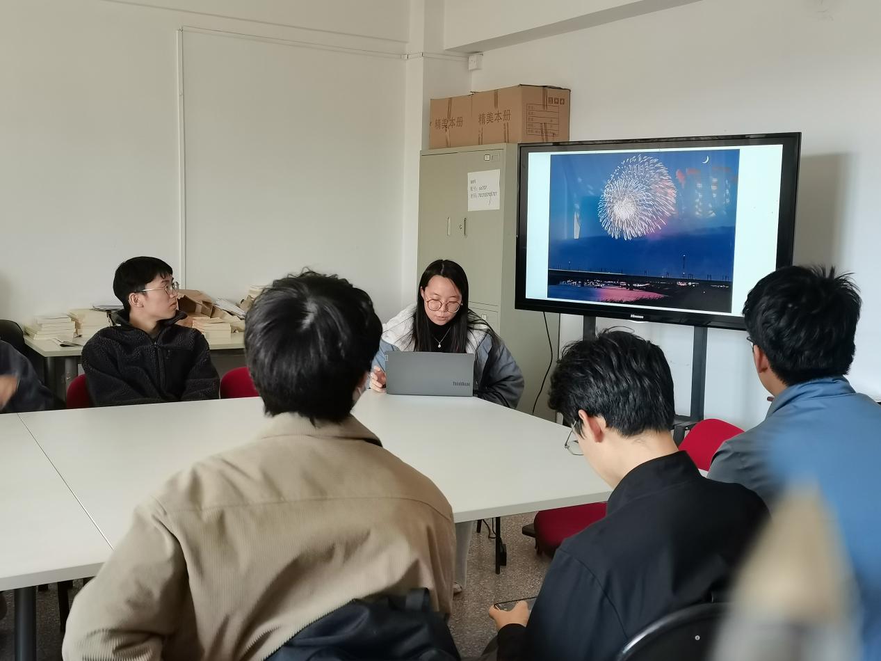 分享会开始时,荣安琪同学首先介绍了烟花的历史渊源、制作工艺以及在中国文化中的象征意义。她生动地描述了烟花在中国各个节日和庆典中的应用,让在场的同学们对烟花有了更深入的认识。