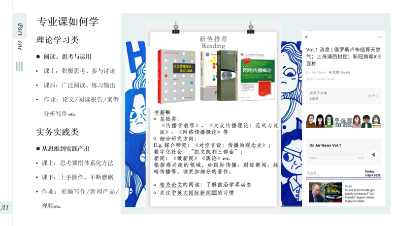 围绕着课程设置,课外活动实践以及未来发展,马新鑫和武佳颖同学为大家介绍了国际新闻传播专业的全景。