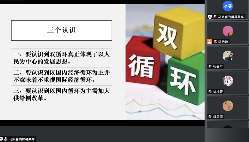 最后,马冰睿和大家分享了《双循环论纲》的阅读感悟,并对此次宣讲活动进行了总结。她表示,《双循环论纲》让我们对“双循环战略”和国家中长期的宏观经济政策有了更深刻的理解。读懂双循环新格局,最重要的是要建立起三个认识。第一,要认识到双循环真正体现了以人民为中心的发展思想;第二,要认识到以国内经济循环为主并不意味着不重视国际经济循环;第三,要认识到以国内循环为主需加大供给侧改革。