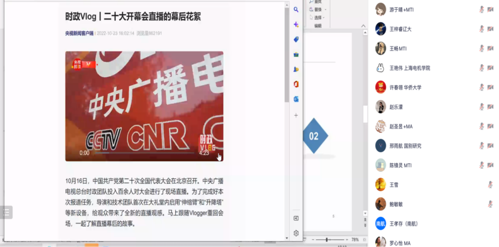 梁老师现场展示了一段“中央广播电视总台对党的二十大报道花絮”视频,让大家切实感受到电视节目对于重大新闻呈现的意义,以及电视新闻人的职业理想,让在场老师和同学们印象深刻。