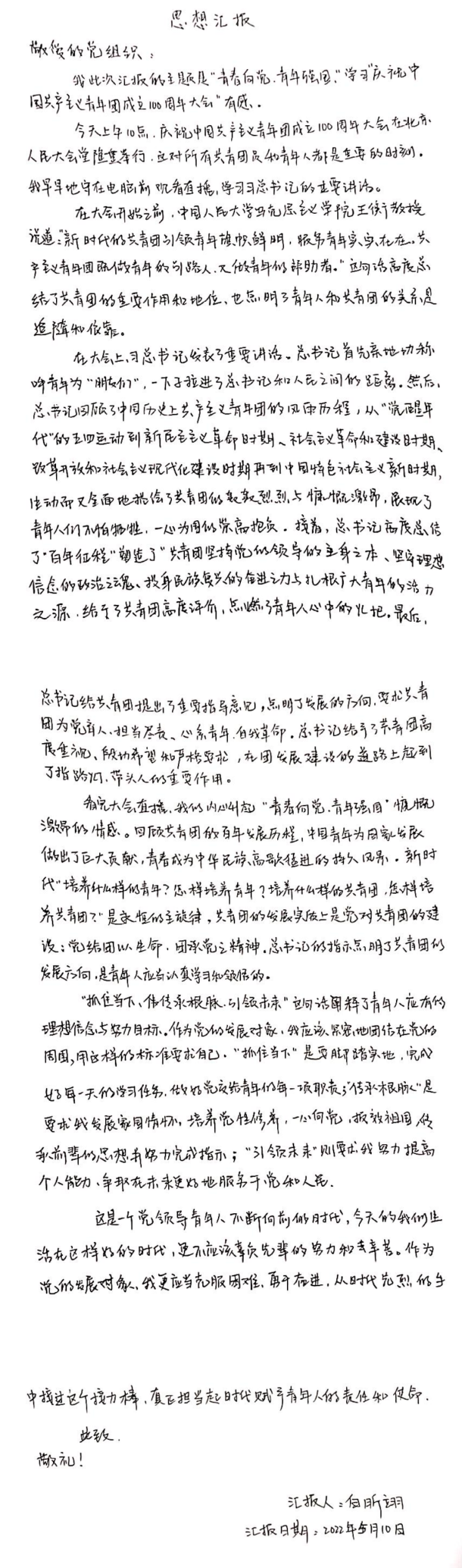 2019级白昕翊谈到,看完大会直播,我的内心升起“青春向党,青年强国”慷慨激昂的情感。这是一个党领导青年不断向前的时代,今天的我们生活在这样的好的时代,更不应该辜负先辈的努力和辛苦。作为党的发展对象,我更应当克服困难,勇于奋进,从时代先烈的手中接过这个接力棒,真正担当起时代赋予青年人的责任和使命。