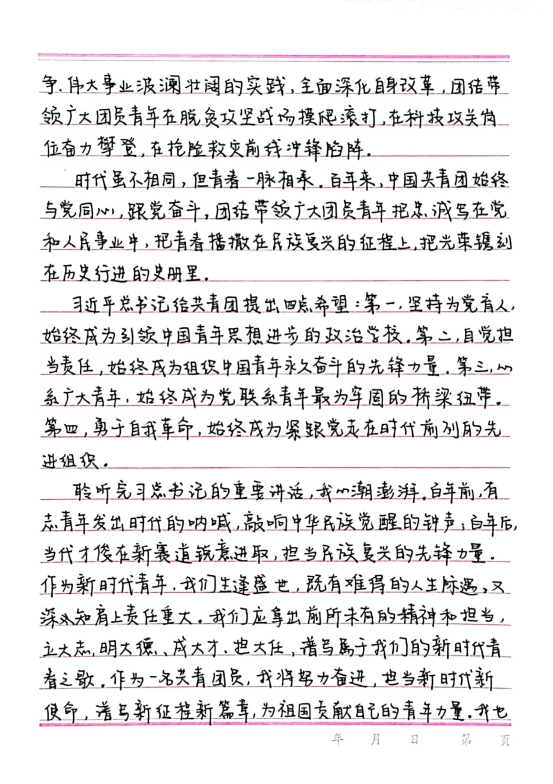 2020级张文程谈到,在实现中华民族伟大复兴的征程上,中国共产党是先锋队,共青团是突击队,少先队是预备队。入队、入团、入党是青年追求政治进步的“人生三部曲”,作为党的发展对象,我会时刻铭记习近平总书记在建团一百周年大会上的讲话,铭记党的嘱托和团的培养,为时代中国贡献属于自己的强国之音,不断开拓更加美好的未来。