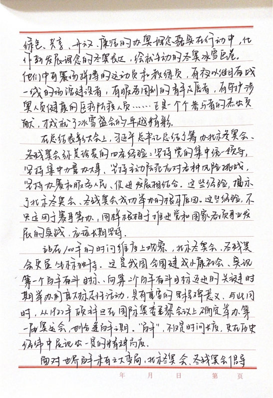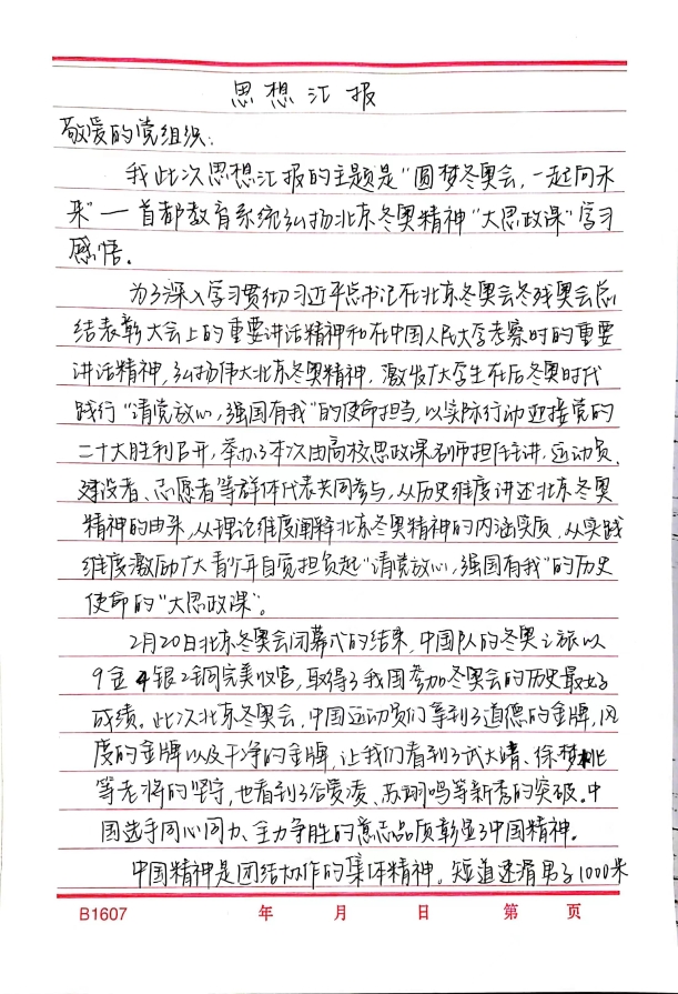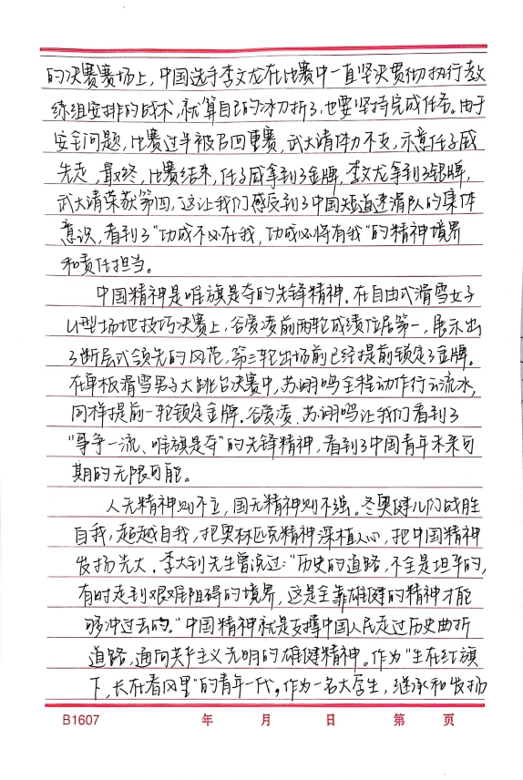 2019级党员马冰睿谈到,在五四青年节之际,人民网面向广大青年推出了弘扬北京冬奥精神“圆梦冬奥会一起向未来”的思政大课。它不仅将北京冬奥精神与青年实践生动结合起来,更从历史层面以及现实层面阐释了我国当代青年的使命与任务并激励广大青少年自觉弘扬北京冬奥精神,奋力担负起“请党放心,强国有我”的历史使命。顺利结束的北京冬奥会以及冬残奥会是青年力量的生动体现和真实写照。我作为一名冬奥会和残奥会志愿者也参与其中,志愿者们在工作中将属于年轻一代蓬勃向上的精神面貌,精益求精,无私奉献的工作态度以及包容友好的中国形象展现得淋漓精致,得到了世界各国的认可。在实现中华民族伟大复兴的新征程中,我们青年一代应当接过历史任务,迎难而上,不畏挑战,以昂扬奋进的姿态书写下无愧时代的壮丽篇章。