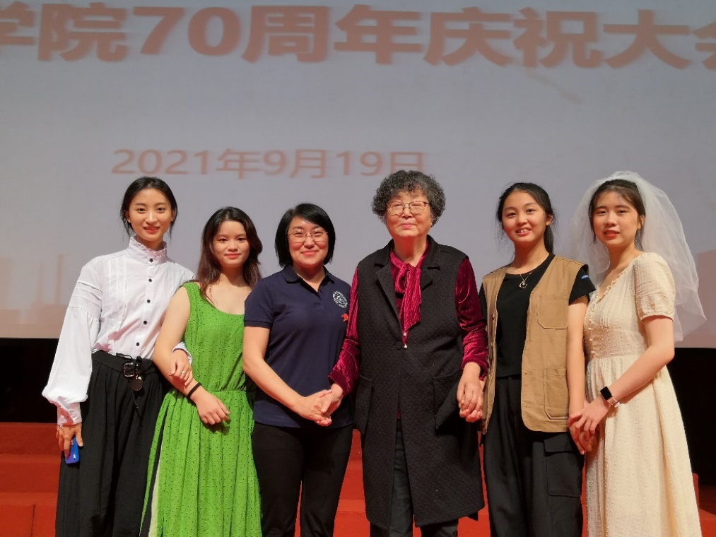 图2 院庆大会表演结束后和贸大资深戏剧专家、退休老教授孙建秋老师(右三),还有免费a片 党委书记项洁老师(左三)合影